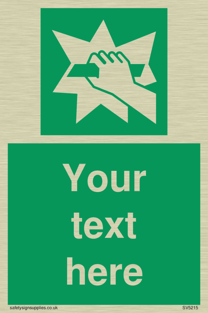 This sign contains a break glass symbol - hand breaking glass in white on green background.