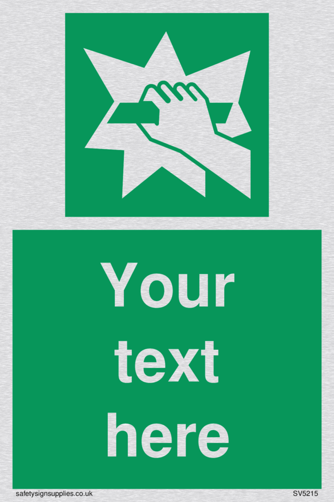 This sign contains a break glass symbol - hand breaking glass in white on green background.