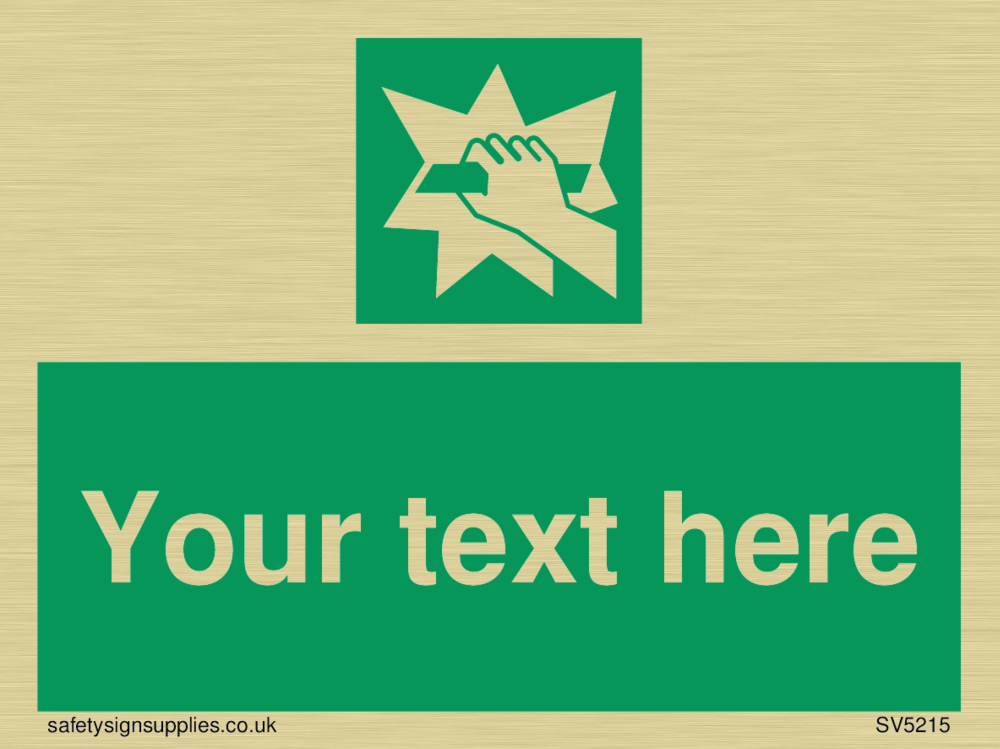 This sign contains a break glass symbol - hand breaking glass in white on green background.