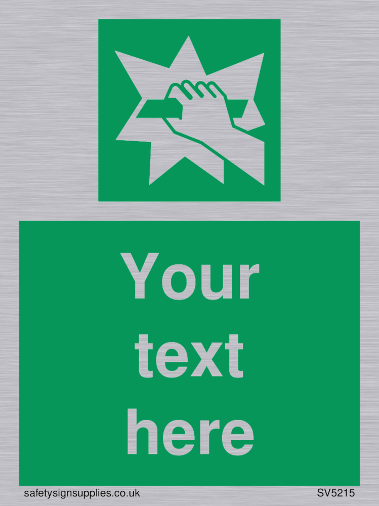 This sign contains a break glass symbol - hand breaking glass in white on green background.