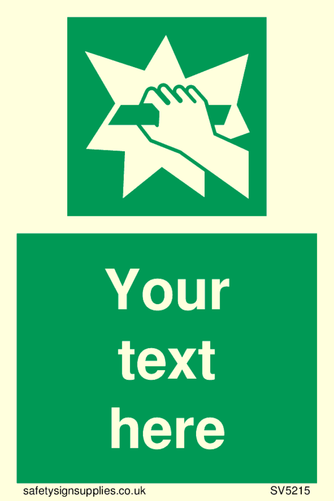 This sign contains a break glass symbol - hand breaking glass in white on green background.