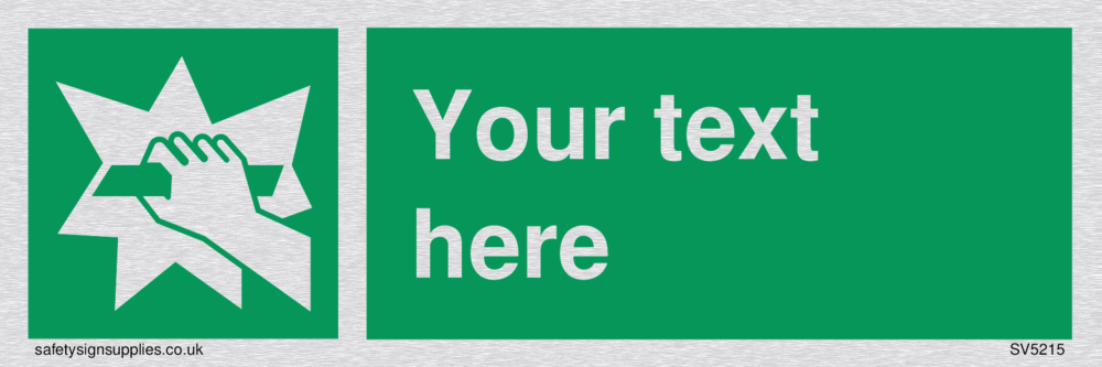 This sign contains a break glass symbol - hand breaking glass in white on green background.
