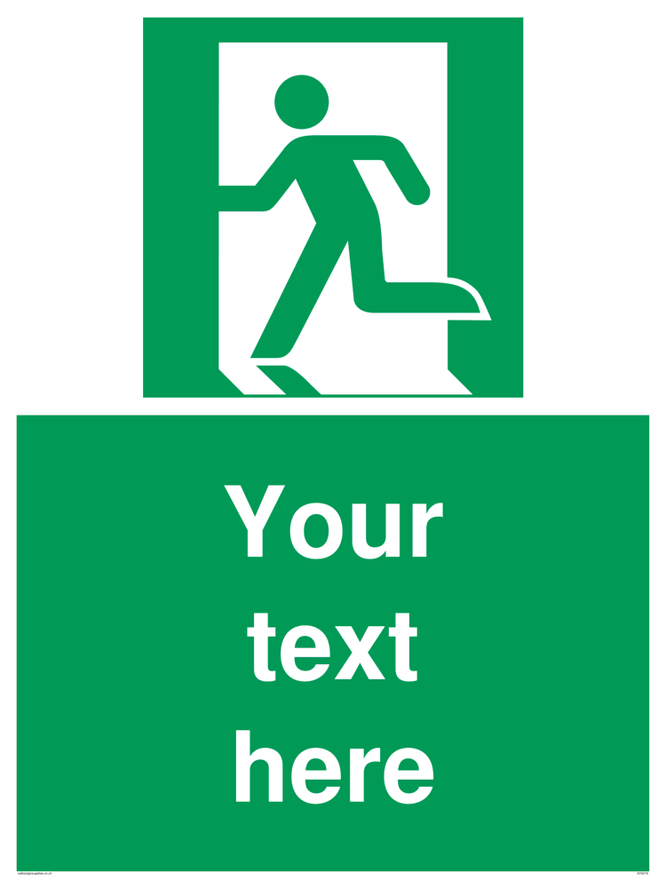 This sign contains a running man on exit facing left symbol - running person in green on exit in white. This symbol is used on BS5499 signs.