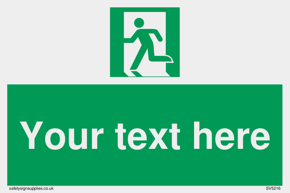 This sign contains a running man on exit facing left symbol - running person in green on exit in white. This symbol is used on BS5499 signs.