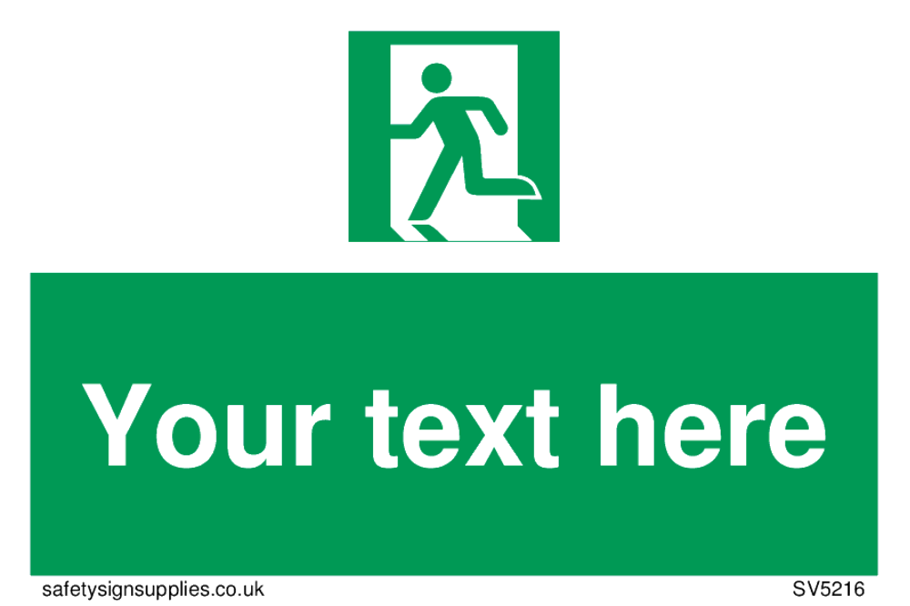 This sign contains a running man on exit facing left symbol - running person in green on exit in white. This symbol is used on BS5499 signs.