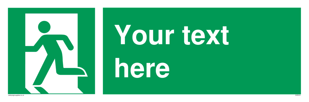 This sign contains a running man on exit facing left symbol - running person in green on exit in white. This symbol is used on BS5499 signs.