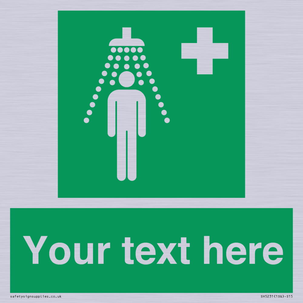 Image content: Human figure under running water coming out of a shower head, first aid cross.