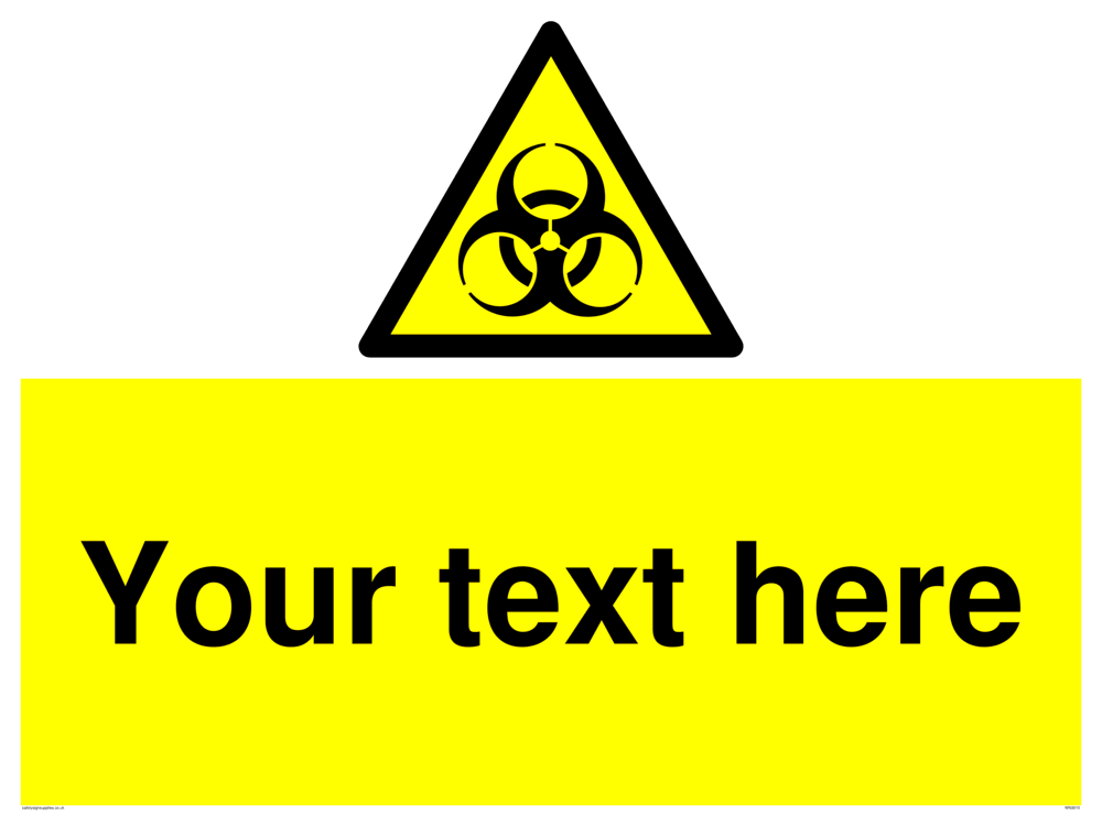 This sign contains a international standard biological hazard symbol. A plain trefoil, which has three circles overlapping each other equally in black on a yellow warning triangle with a black border.