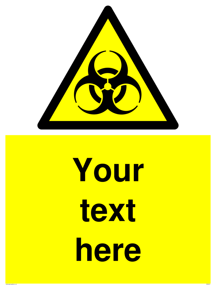This sign contains a international standard biological hazard symbol. A plain trefoil, which has three circles overlapping each other equally in black on a yellow warning triangle with a black border.