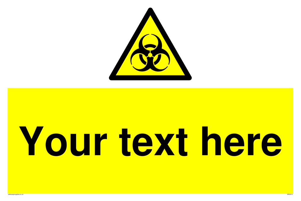 This sign contains a international standard biological hazard symbol. A plain trefoil, which has three circles overlapping each other equally in black on a yellow warning triangle with a black border.