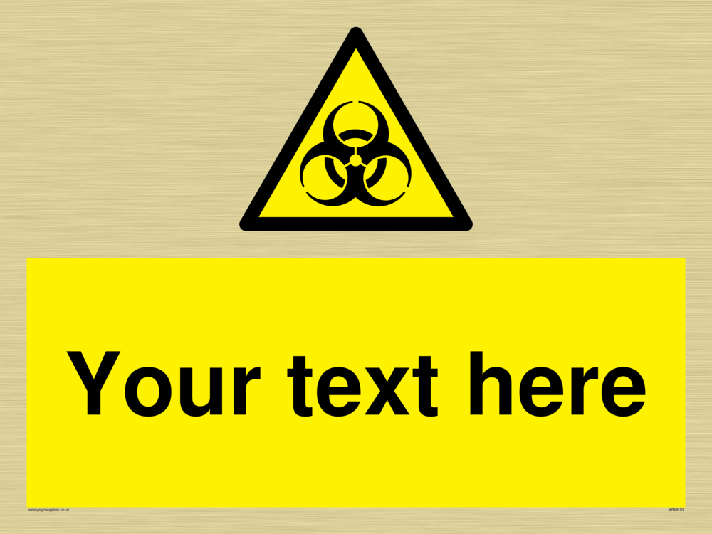 This sign contains a international standard biological hazard symbol. A plain trefoil, which has three circles overlapping each other equally in black on a yellow warning triangle with a black border.