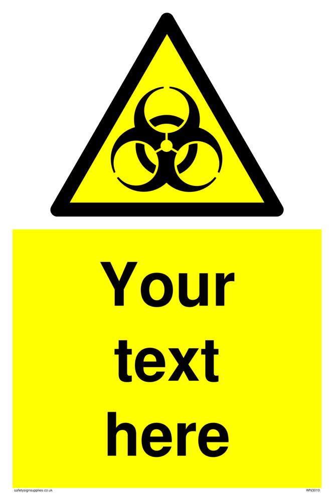 This sign contains a international standard biological hazard symbol. A plain trefoil, which has three circles overlapping each other equally in black on a yellow warning triangle with a black border.