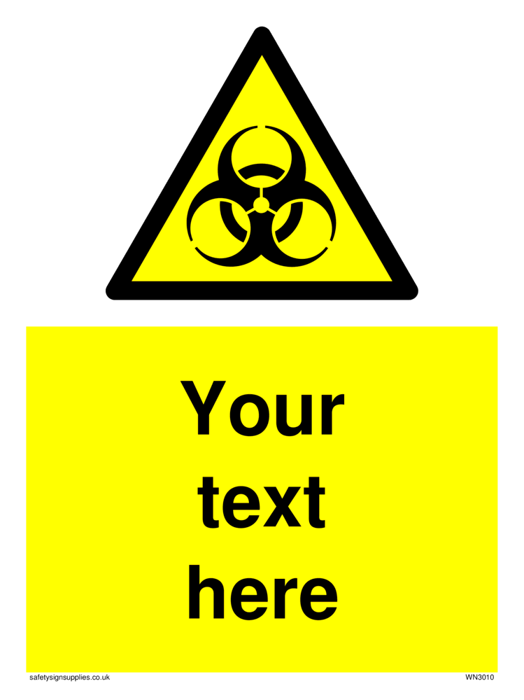 This sign contains a international standard biological hazard symbol. A plain trefoil, which has three circles overlapping each other equally in black on a yellow warning triangle with a black border.