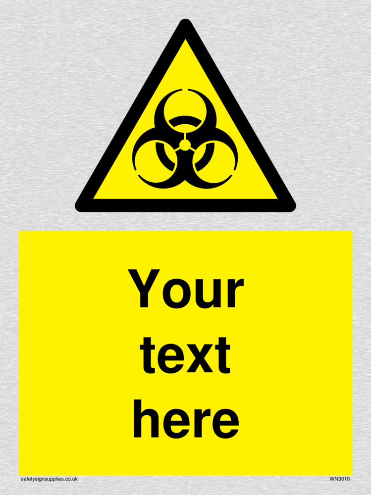 This sign contains a international standard biological hazard symbol. A plain trefoil, which has three circles overlapping each other equally in black on a yellow warning triangle with a black border.