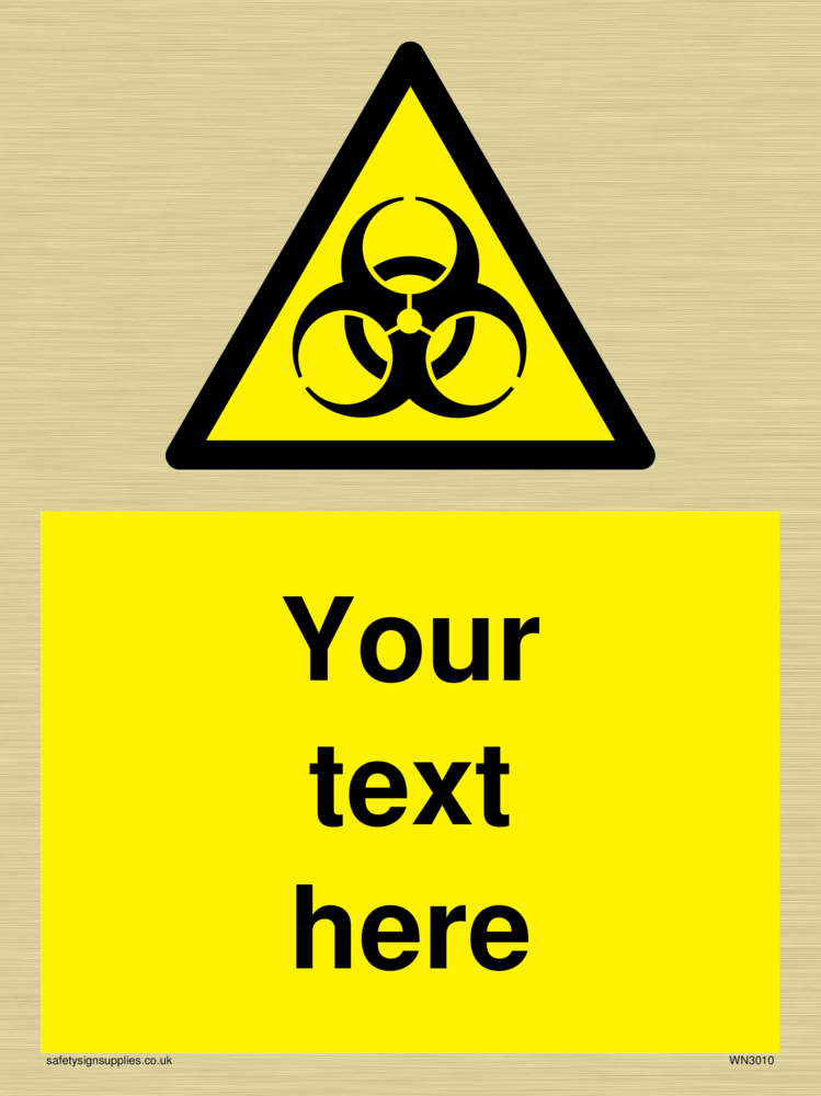 This sign contains a international standard biological hazard symbol. A plain trefoil, which has three circles overlapping each other equally in black on a yellow warning triangle with a black border.
