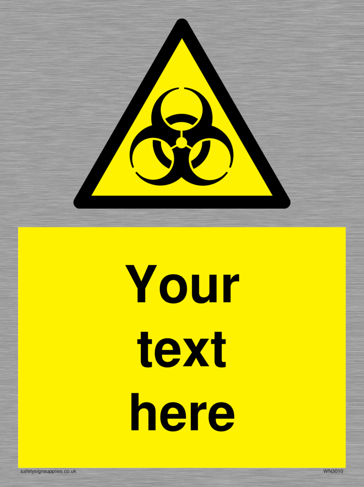 This sign contains a international standard biological hazard symbol. A plain trefoil, which has three circles overlapping each other equally in black on a yellow warning triangle with a black border.