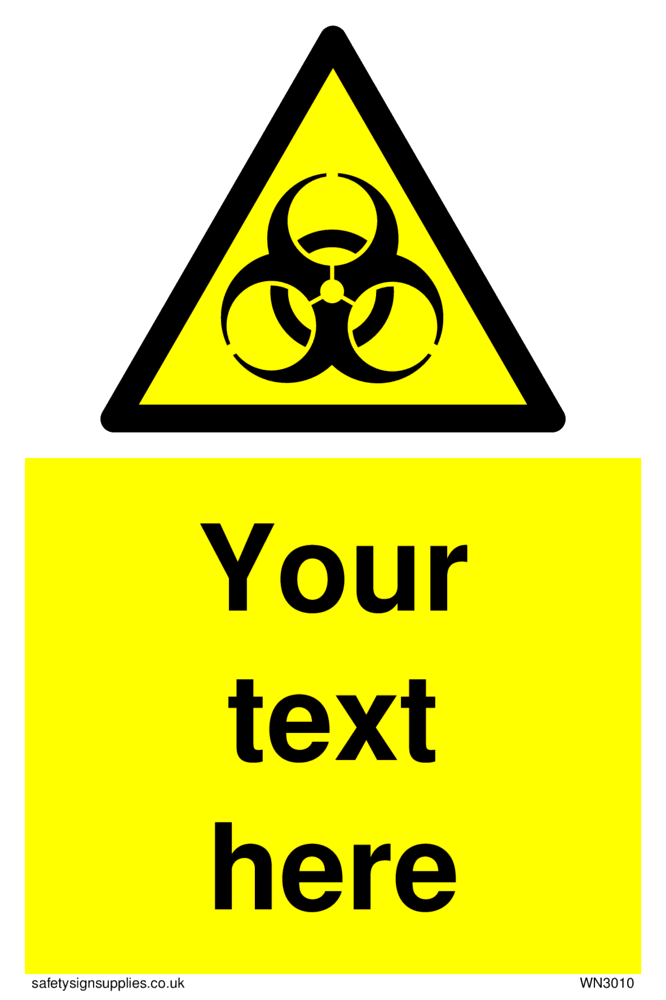 This sign contains a international standard biological hazard symbol. A plain trefoil, which has three circles overlapping each other equally in black on a yellow warning triangle with a black border.