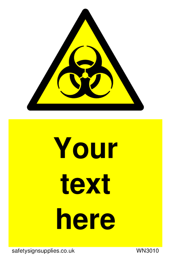 This sign contains a international standard biological hazard symbol. A plain trefoil, which has three circles overlapping each other equally in black on a yellow warning triangle with a black border.