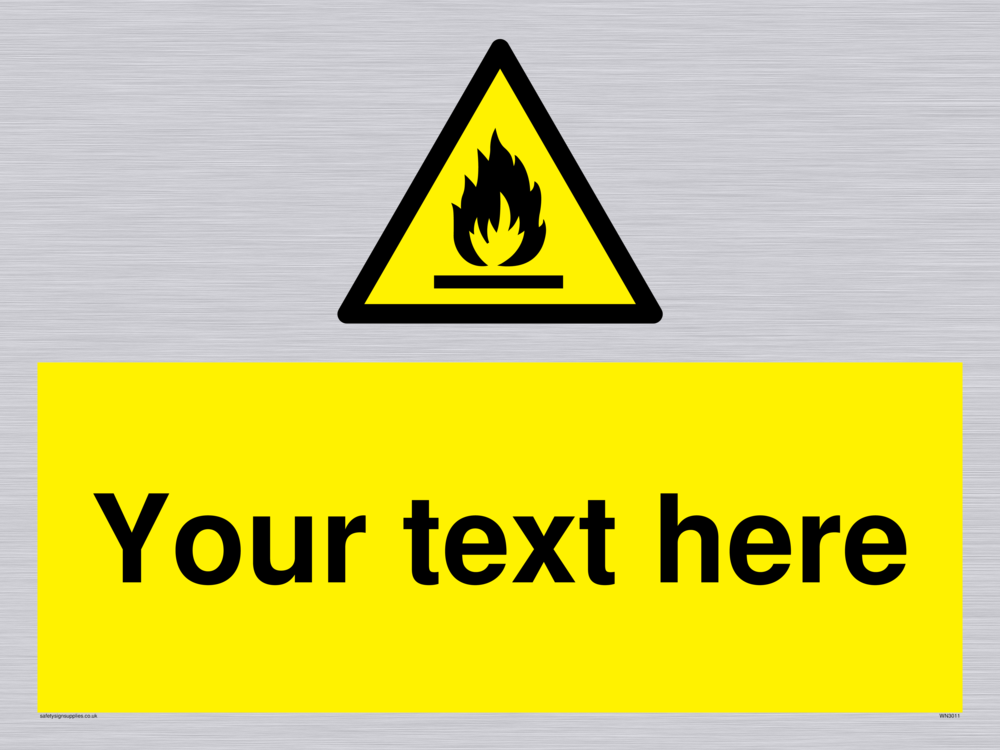 This sign contains an international standard flammable symbol, Flat bar with flames in black.