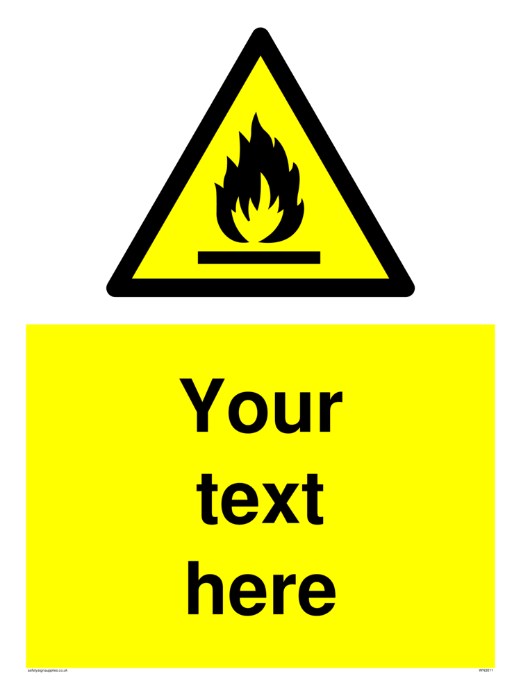 This sign contains an international standard flammable symbol, Flat bar with flames in black.
