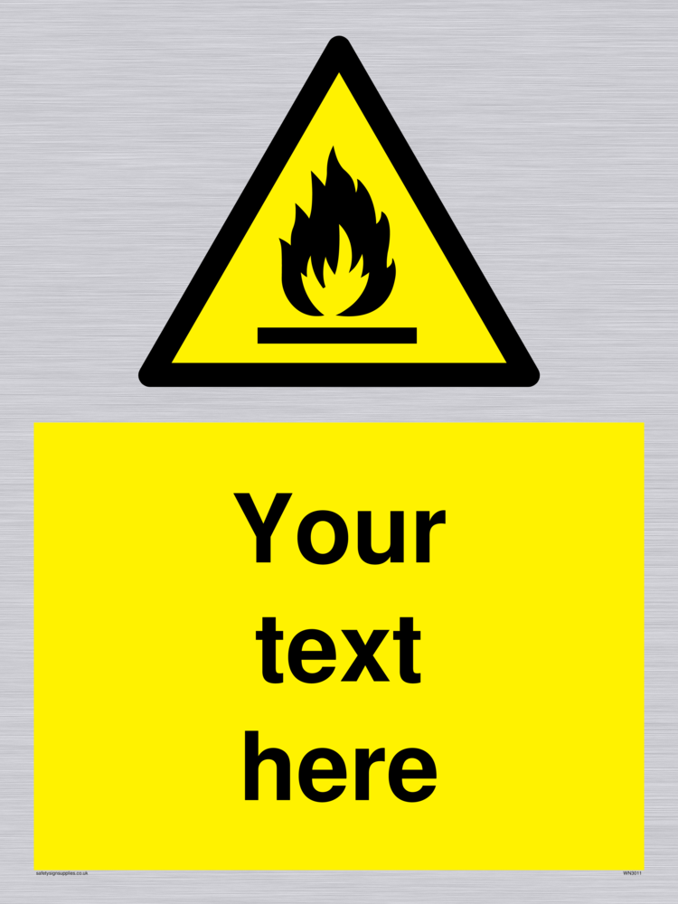 This sign contains an international standard flammable symbol, Flat bar with flames in black.