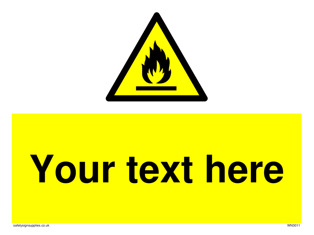 This sign contains an international standard flammable symbol, Flat bar with flames in black.