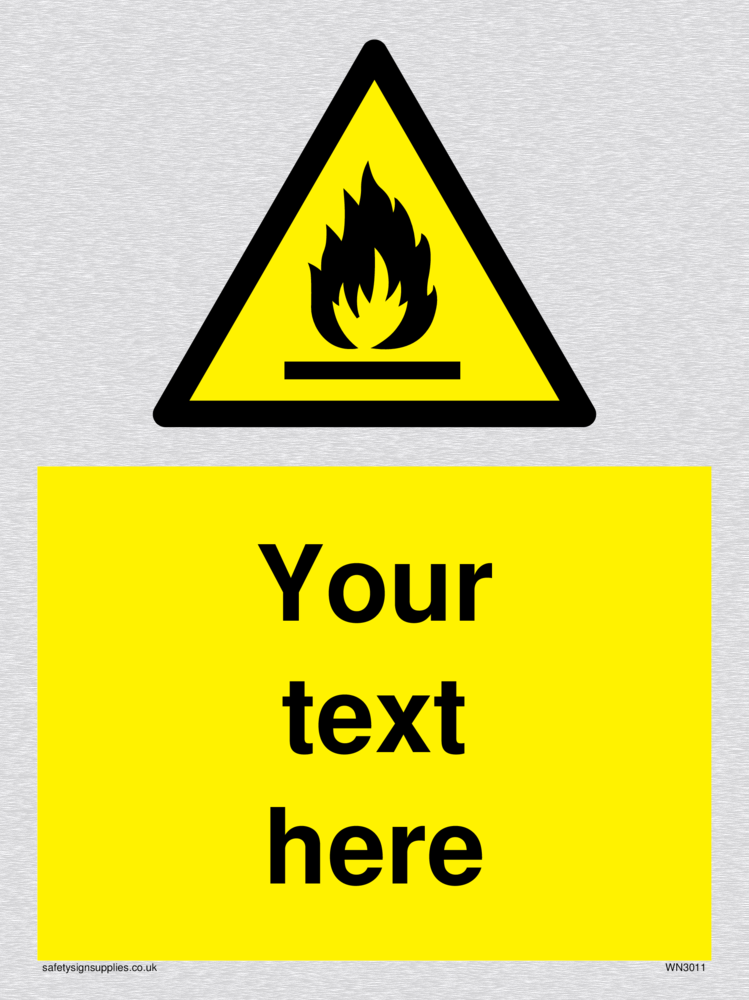This sign contains an international standard flammable symbol, Flat bar with flames in black.