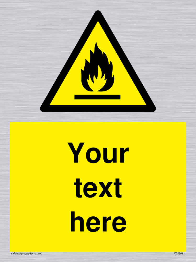 This sign contains an international standard flammable symbol, Flat bar with flames in black.