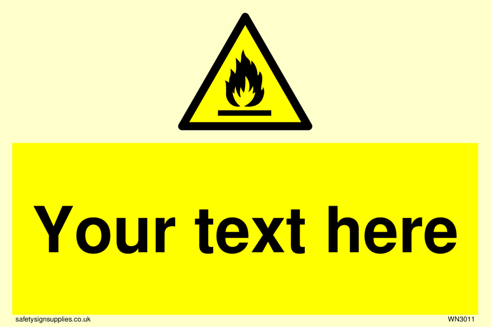 This sign contains an international standard flammable symbol, Flat bar with flames in black.