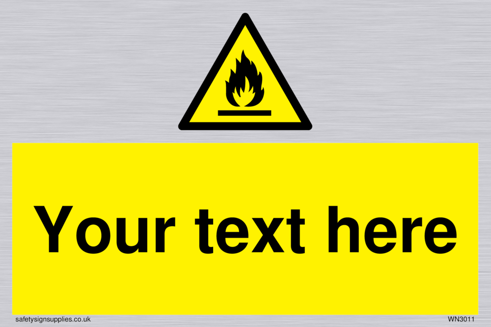 This sign contains an international standard flammable symbol, Flat bar with flames in black.