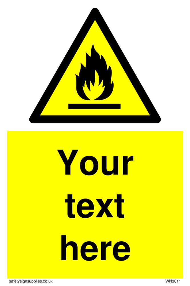 This sign contains an international standard flammable symbol, Flat bar with flames in black.