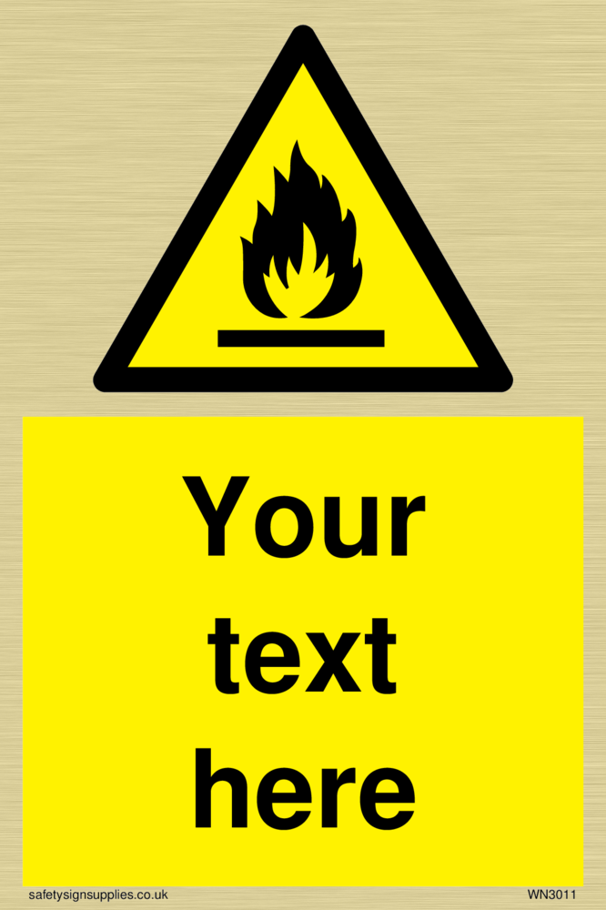 This sign contains an international standard flammable symbol, Flat bar with flames in black.