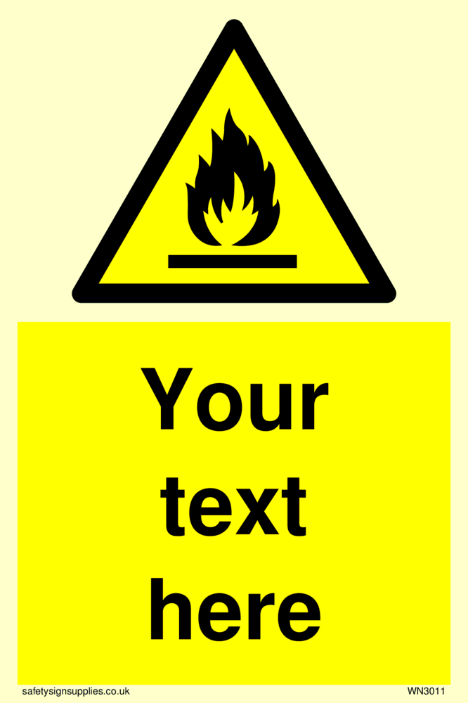 This sign contains an international standard flammable symbol, Flat bar with flames in black.