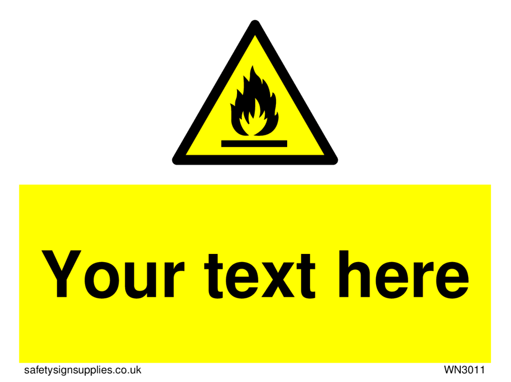 This sign contains an international standard flammable symbol, Flat bar with flames in black.