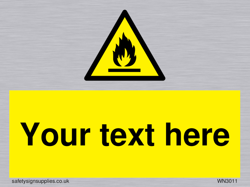 This sign contains an international standard flammable symbol, Flat bar with flames in black.
