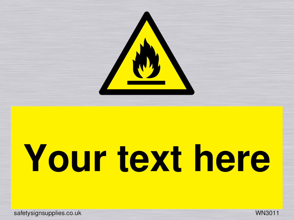 This sign contains an international standard flammable symbol, Flat bar with flames in black.