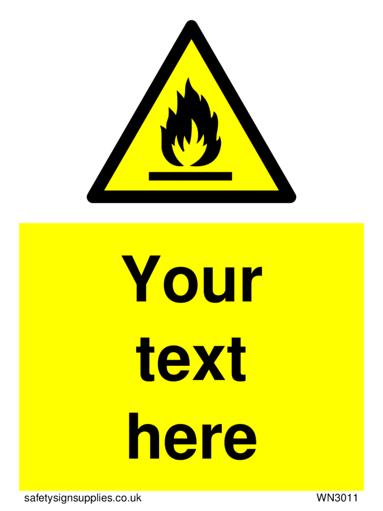 This sign contains an international standard flammable symbol, Flat bar with flames in black.