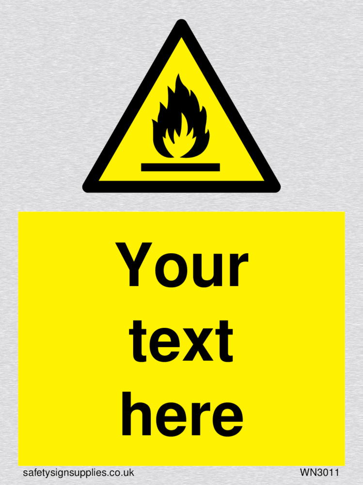 This sign contains an international standard flammable symbol, Flat bar with flames in black.