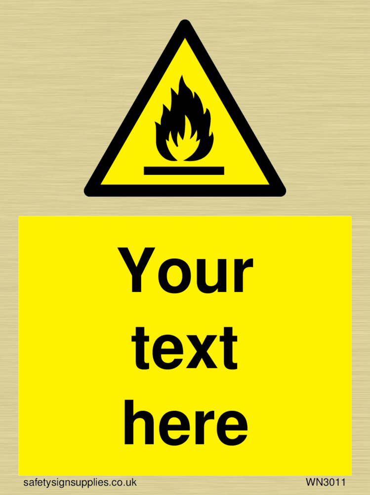 This sign contains an international standard flammable symbol, Flat bar with flames in black.