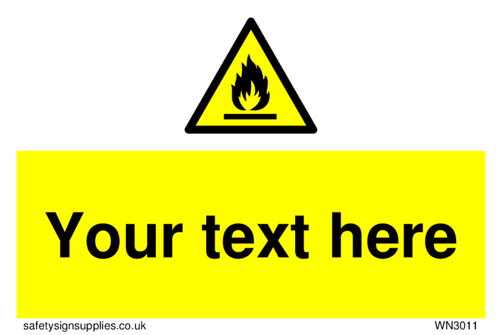 This sign contains an international standard flammable symbol, Flat bar with flames in black.