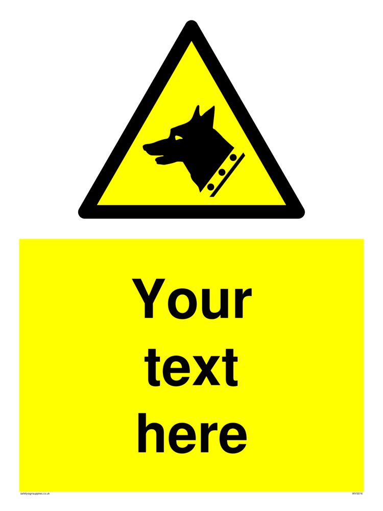 Dog signs contain instructions or rules relating to dogs. Custom signs contain the text required by the customer. With your your text and a standard safety sign symbol - a bespoke sign can fit any requirement. This sign is large.