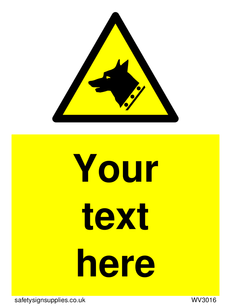 This sign contains a guard dog warning symbol. Guard dog in black on yellow warning triangle with black border.
