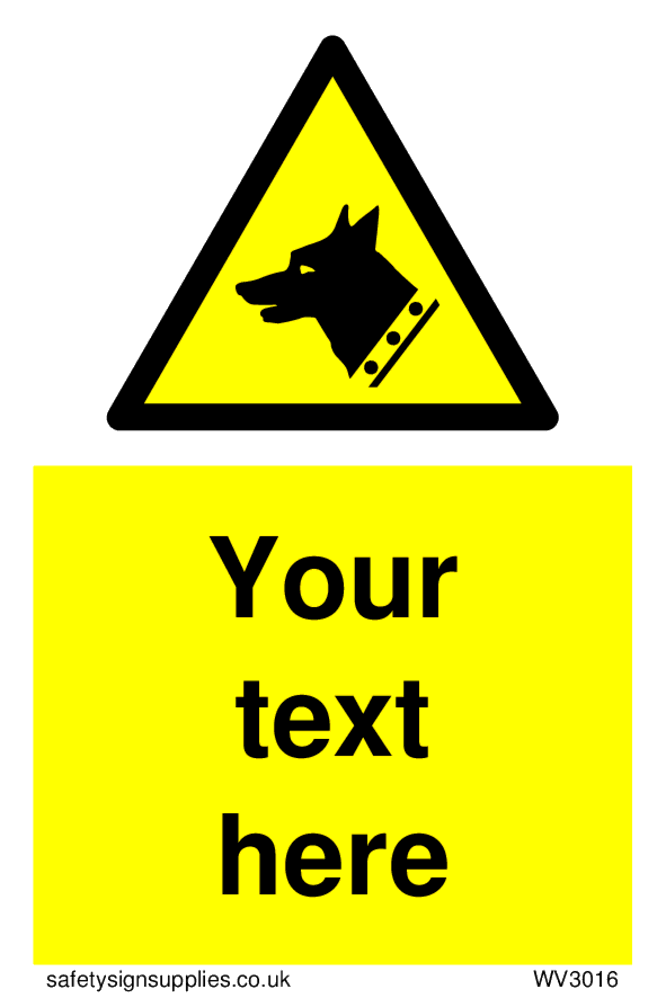 This sign contains a guard dog warning symbol. Guard dog in black on yellow warning triangle with black border.