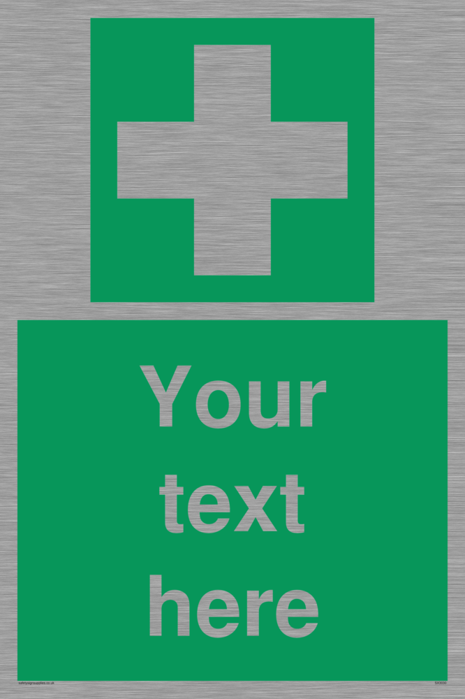 This sign contains a first aid symbol - universal first aid cross in white on green background.