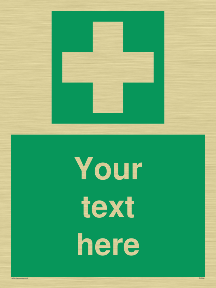This sign contains a first aid symbol - universal first aid cross in white on green background.