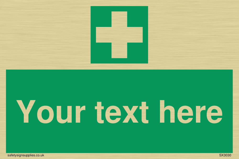 This sign contains a first aid symbol - universal first aid cross in white on green background.
