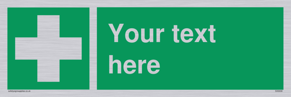 This sign contains a first aid symbol - universal first aid cross in white on green background.