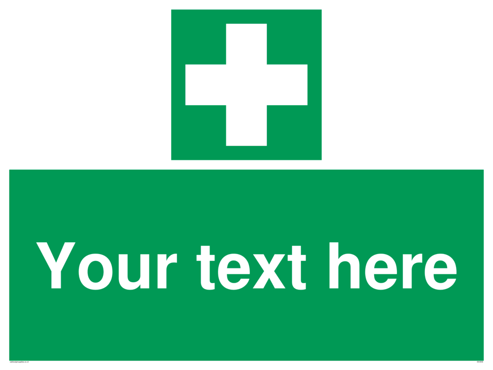 This sign contains a first aid symbol - universal first aid cross in white on green background.