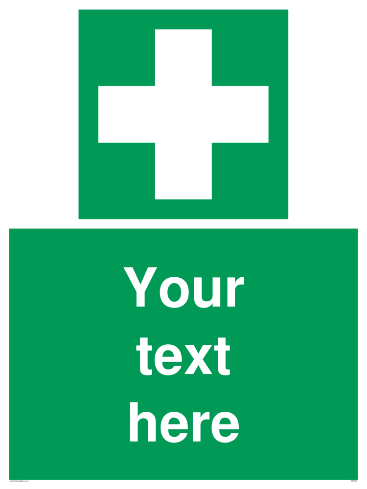This sign contains a first aid symbol - universal first aid cross in white on green background.