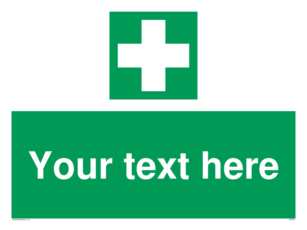 This sign contains a first aid symbol - universal first aid cross in white on green background.